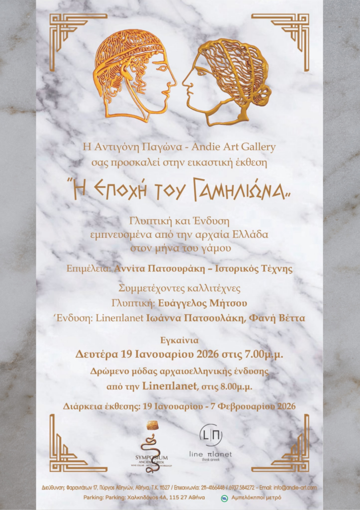 Τη Δευτέρα 19 Ιανουαρίου 2026 και ώρα 7.00μ.μ., εγκαινιάζεται η εικαστική έκθεση με τίτλο “Η εποχή του Γαμηλιώνα” στην Andie Art Gallery – Φαραντάτων 17, Πύργος Αθηνών.